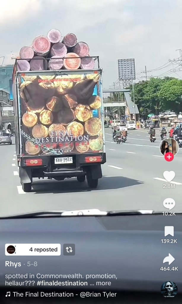 A user named Rhys posted a clip of a truck made to look like it was carrying giant logs, clearly a nod to the infamous Final Destination 2 scene. According to the caption, the truck was spotted along Commonwealth Avenue in Quezon City. As of this writing, the video has over 18 million views, 2.8 million likes, and more than 100,000 shares. It’s even been picked up by international media. Clearly, millennials who were scarred for life by that highway scene felt seen because we’ve all been lowkey traumatized since.